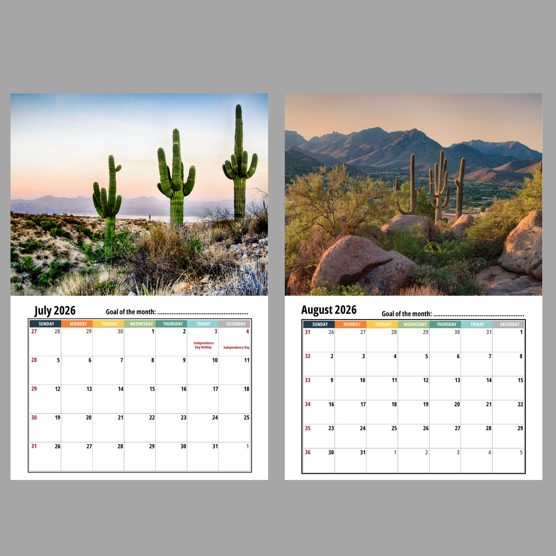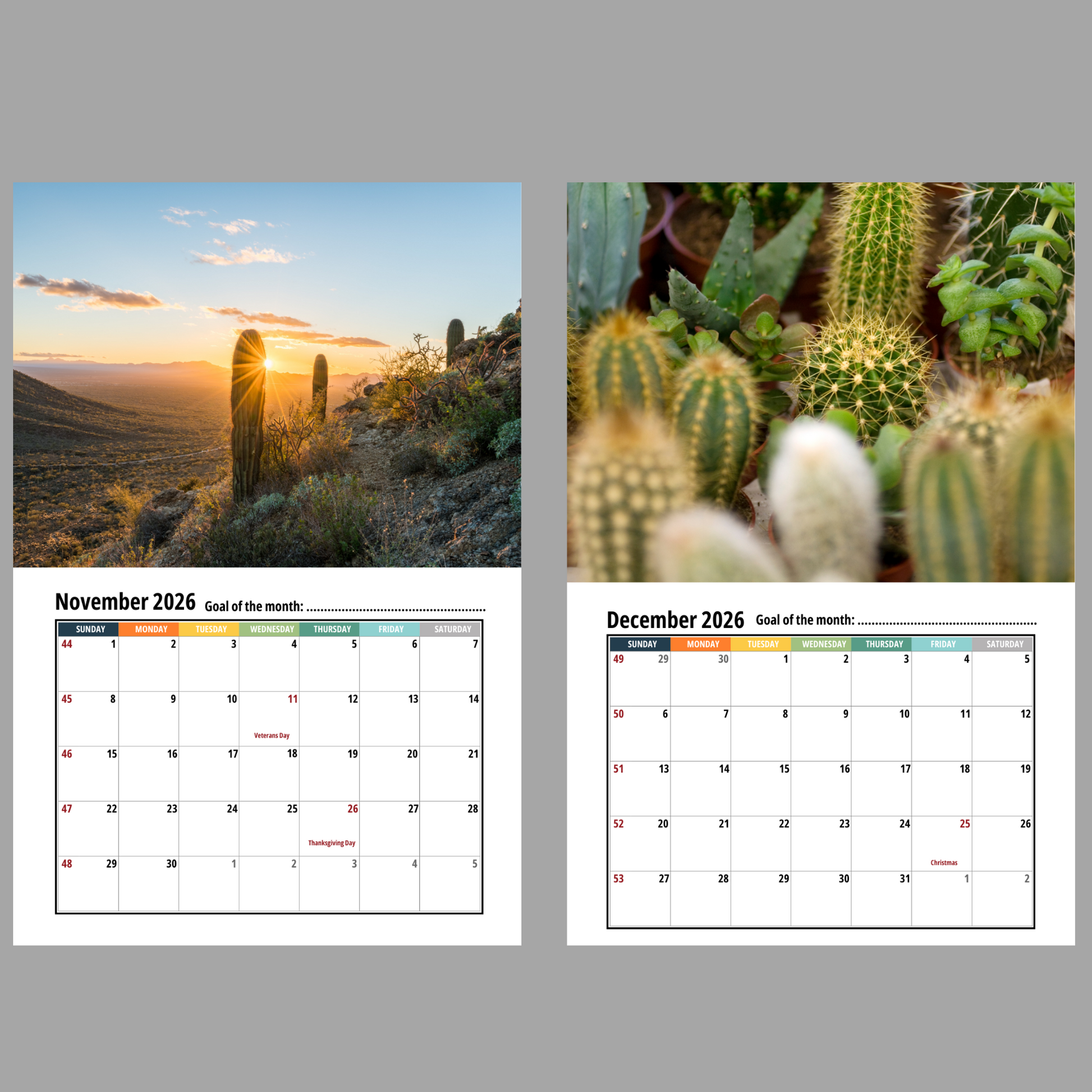 Embrace the beauty of the desert with our Cactus Calendar 2026! This stunning wall calendar features a unique selection of vibrant cactus illustrations for each month. Available in a Ledger vertical (11" x 16.5") size for US & Canada markets and A3 vertical (29.7 x 42 cm) for the rest of the world, it's the perfect way to add a touch of nature-inspired design to your home or office. Stay organized and bring a little bit of the outdoors in with this beautiful and functional 2026 cactus calendar.