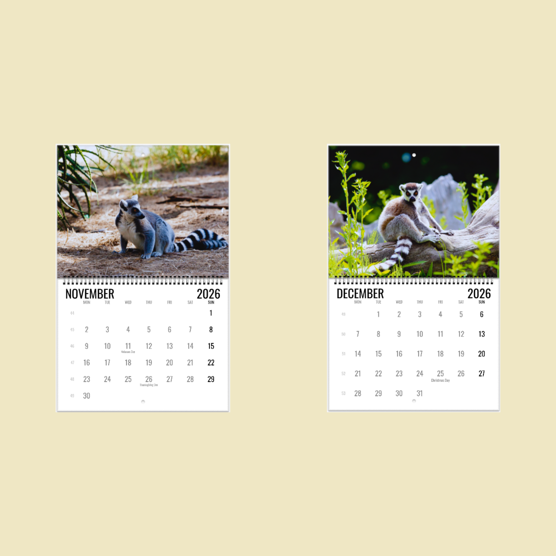 Brighten your year with the Lemur Wall Calendar 2026! Featuring 12 months of stunning, high-quality photographs of these adorable and unique primates, this calendar is perfect for animal lovers and anyone who wants to bring a touch of the wild into their home or office. With a large grid for easy organization, this 2026 animal calendar makes a fantastic gift for Christmas or the New Year.